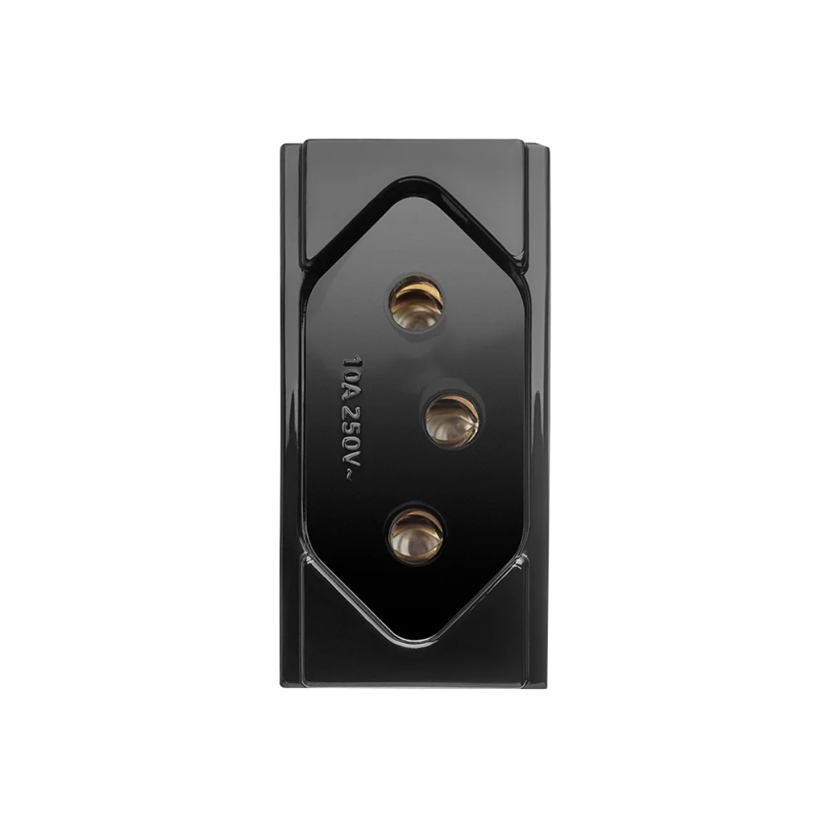 Conjunto Tomada 2P+T. Segurança: evita choques por inserções parciais. Atende as diretivas RoHS. Design inovador, fácil de instalar e limpar, com superfície em extra brilho. Corrente de 20A e tensão 250V. Produzido em material termorplástico de alta performance, com aditivo anti UV e anti poeira que auxilia na conservação do produto. Disponível na cor preta.